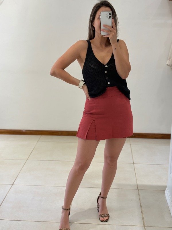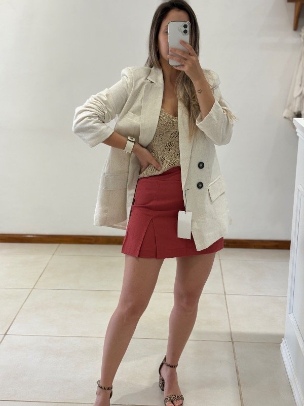 Short pollera de lino con tajo al costado y cierre escondido. Calce perfecto.