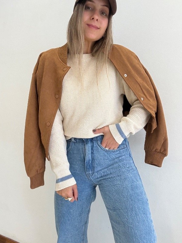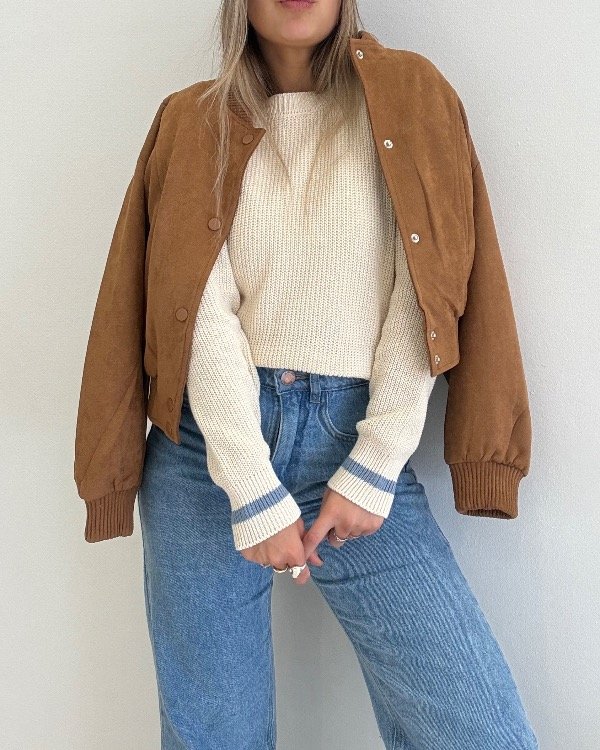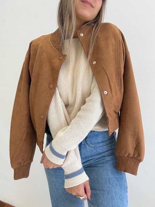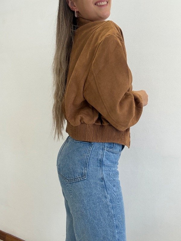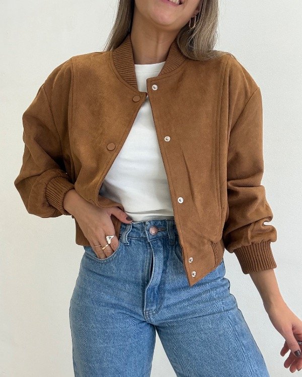 Campera corte bomber con botones y bolsillos, de gamuza, forrada y con elastico.