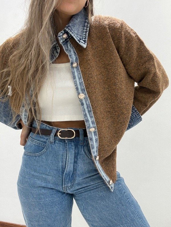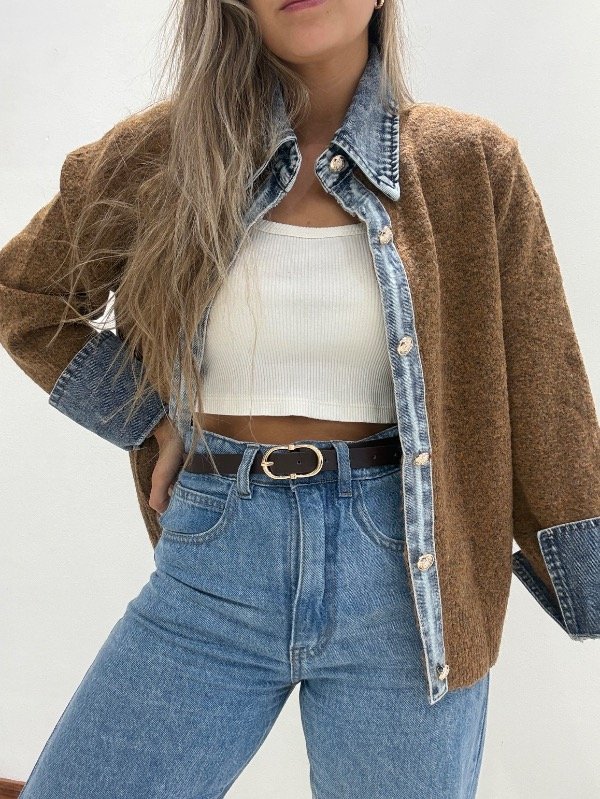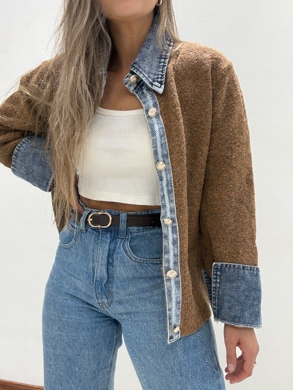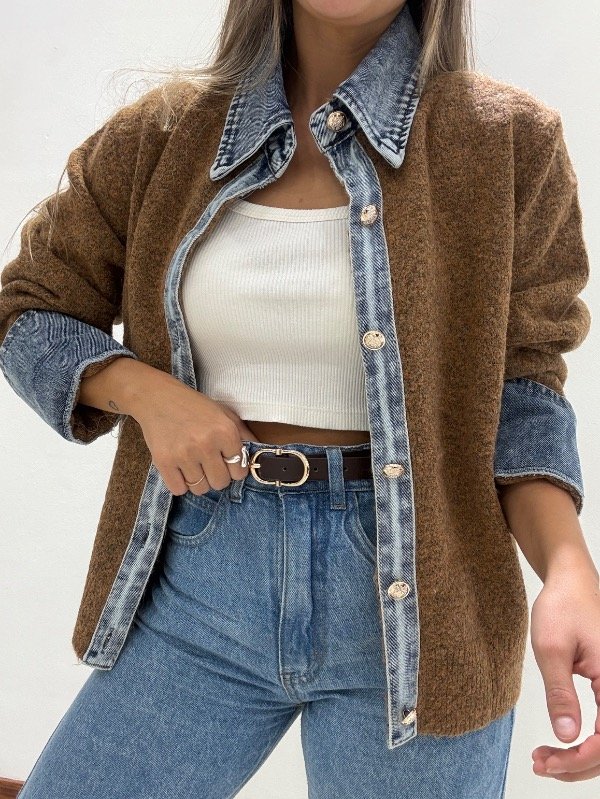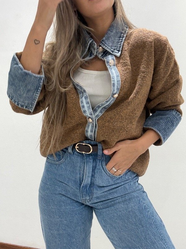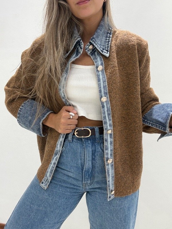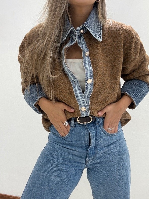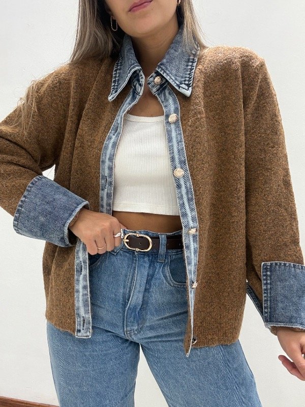 Cárdigan importado de lana gruesa con detalles en jeans. 5 botones.