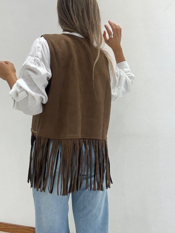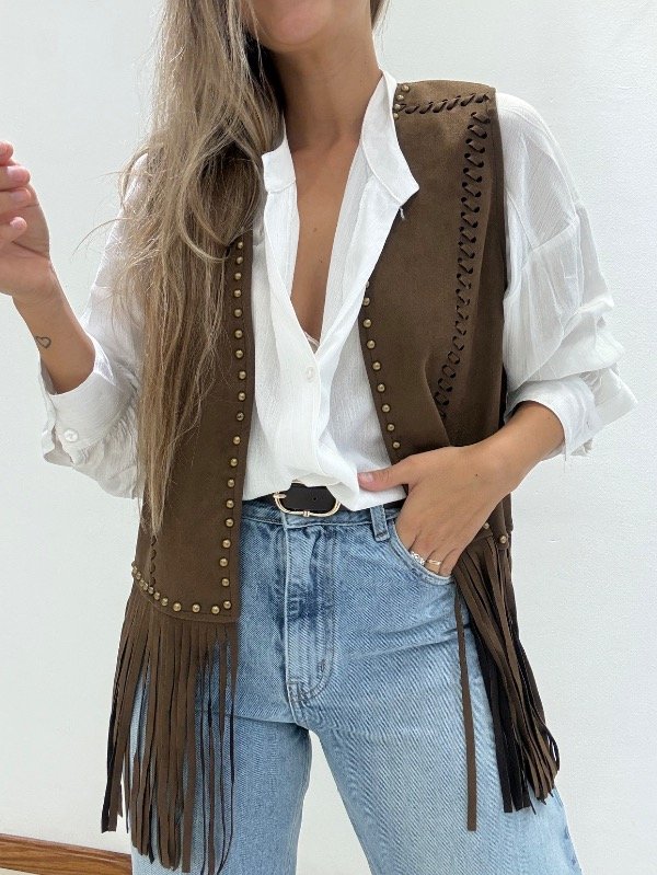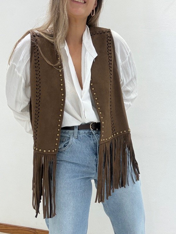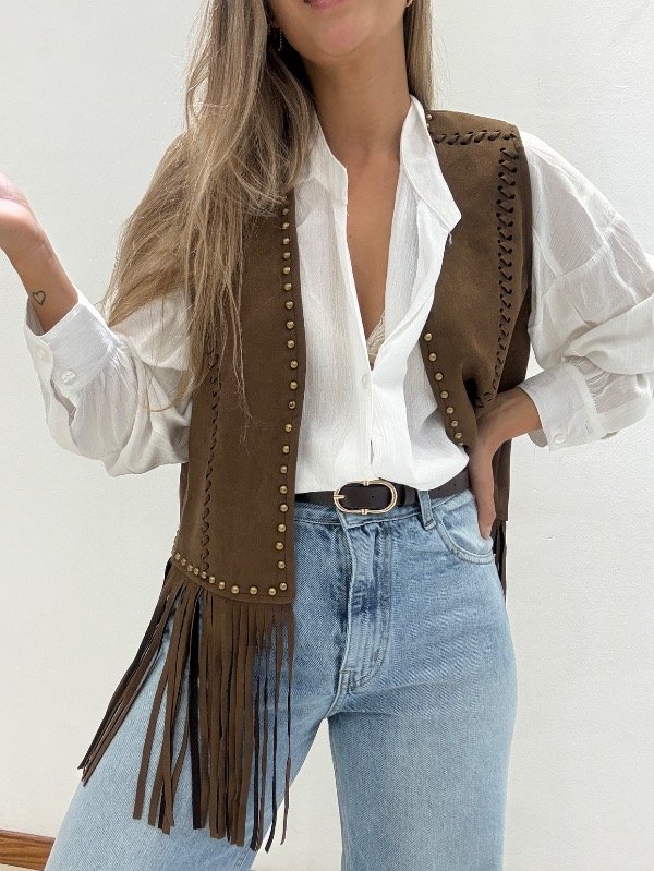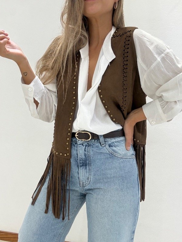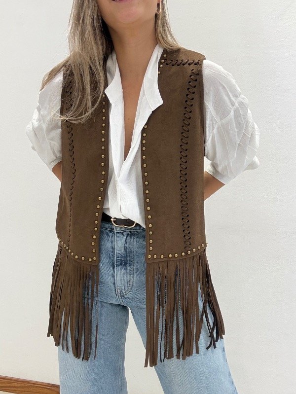 Chaleco importado de gamuza con tachas y flecos.