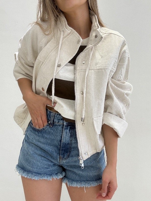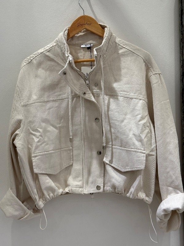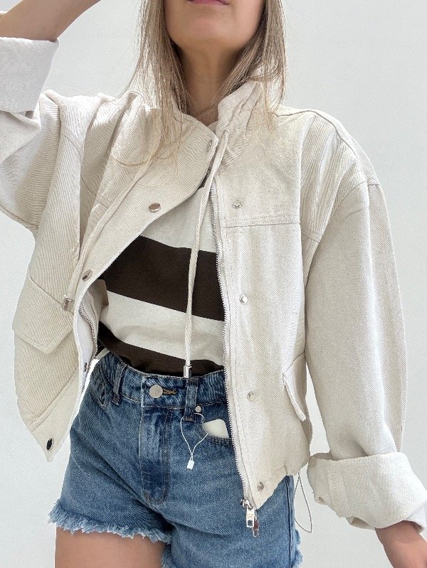 Campera importada de gabardina tipo cargo, con botones, cierre, bolsillos y elástico para ajustar debajo.