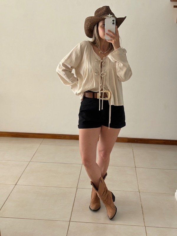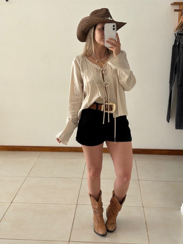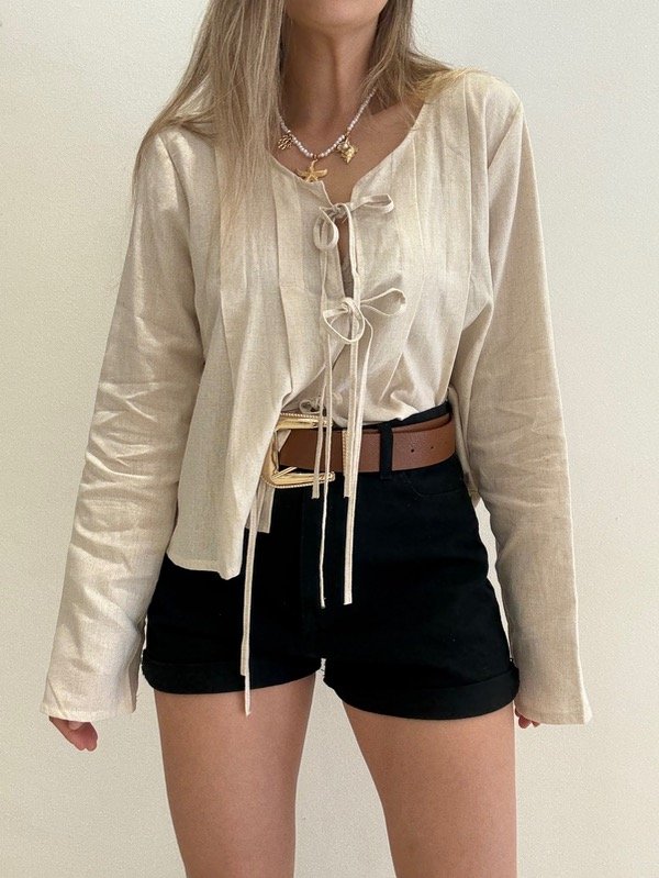 Blusa de lino con tablitas y tiras para atar delante. Manga ancha.