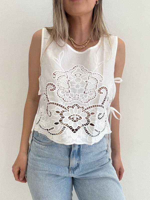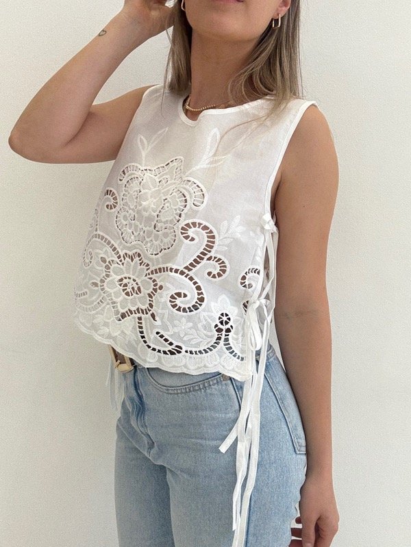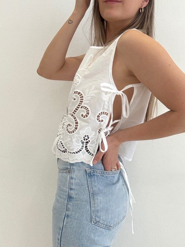Blusa calada de broderie para atar a los costados. Podes usarla como chaleco.