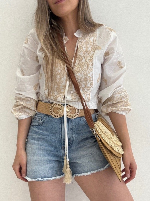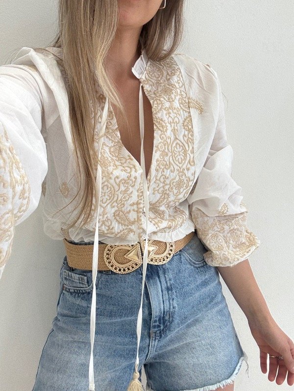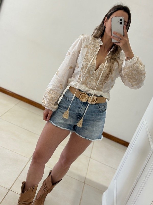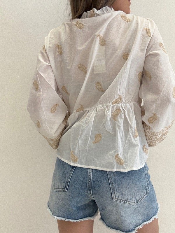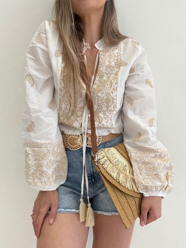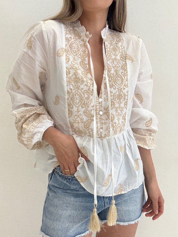 Blusa importada bordada con borlas y elástico en las mangas.